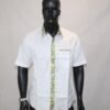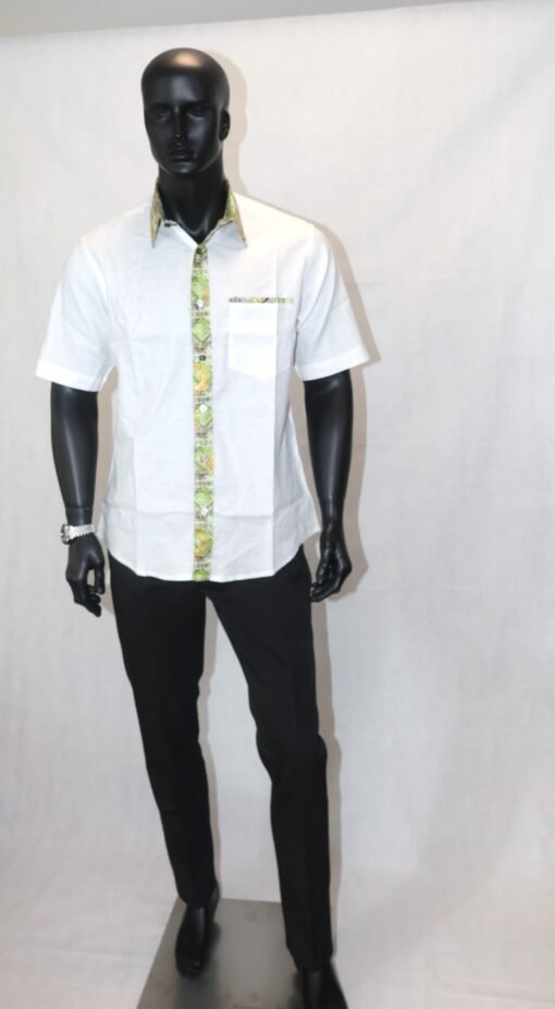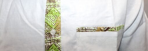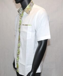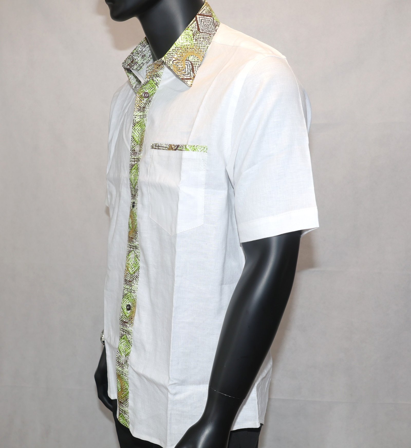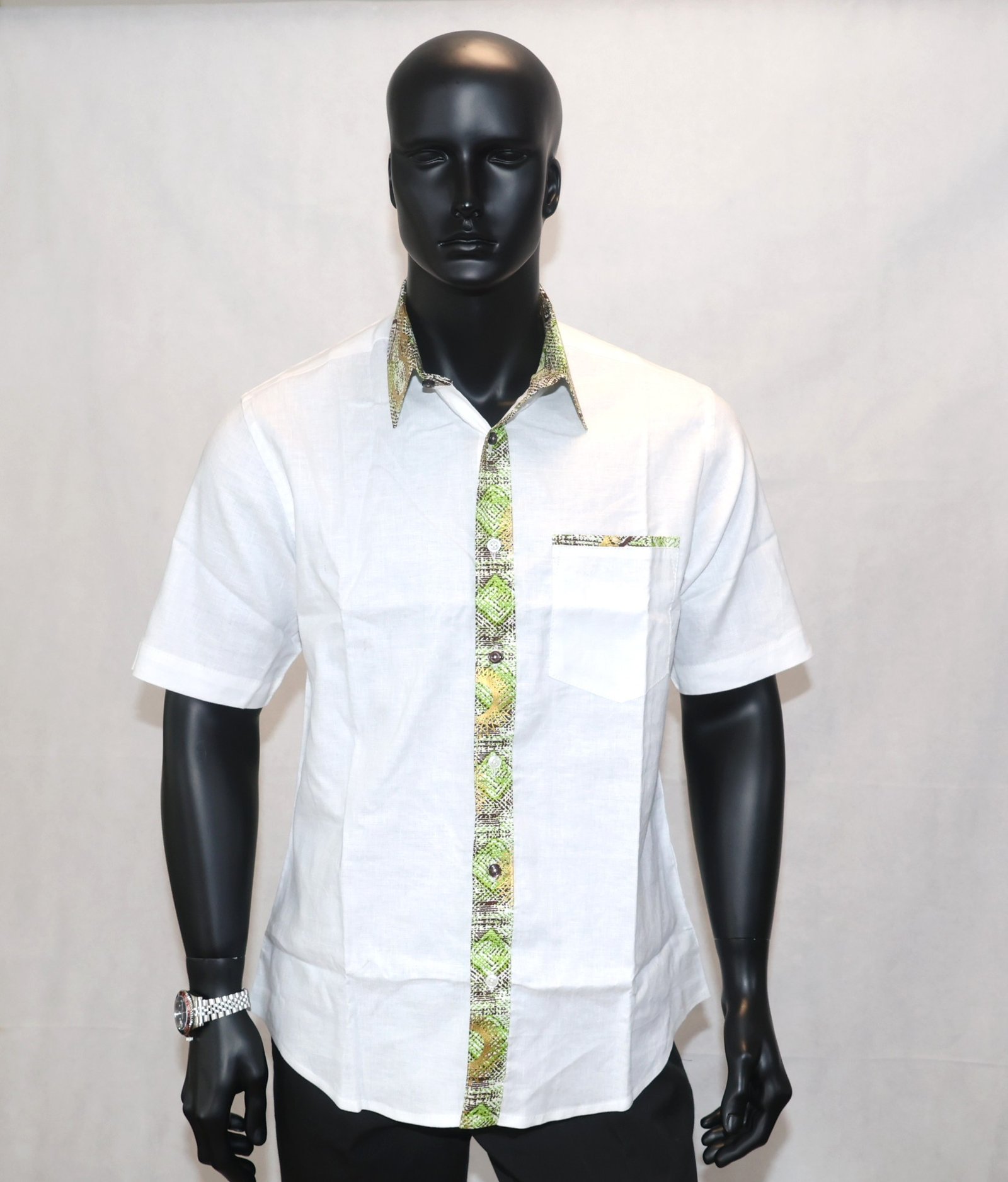 Chemise Homme col tailleur Lin blanc – wax vert courte manche