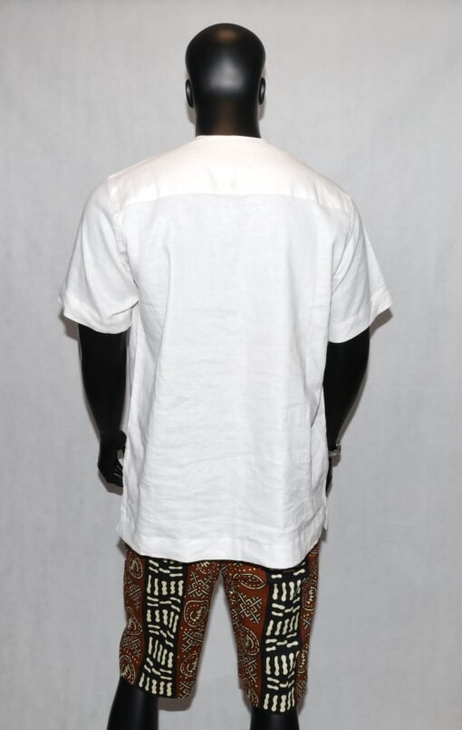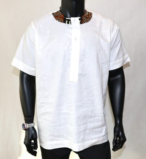 Affirmez votre style avec cette chemise afrochic haut de gamme, confectionnée à partir d’un lin de qualité supérieure (disponible en bleu-ciel ou en blanc ), allié à des touches raffinées de wax premium aux motifs africains contemporains.