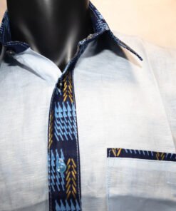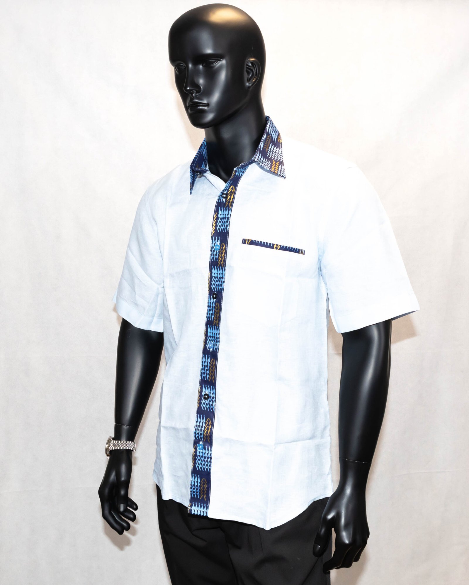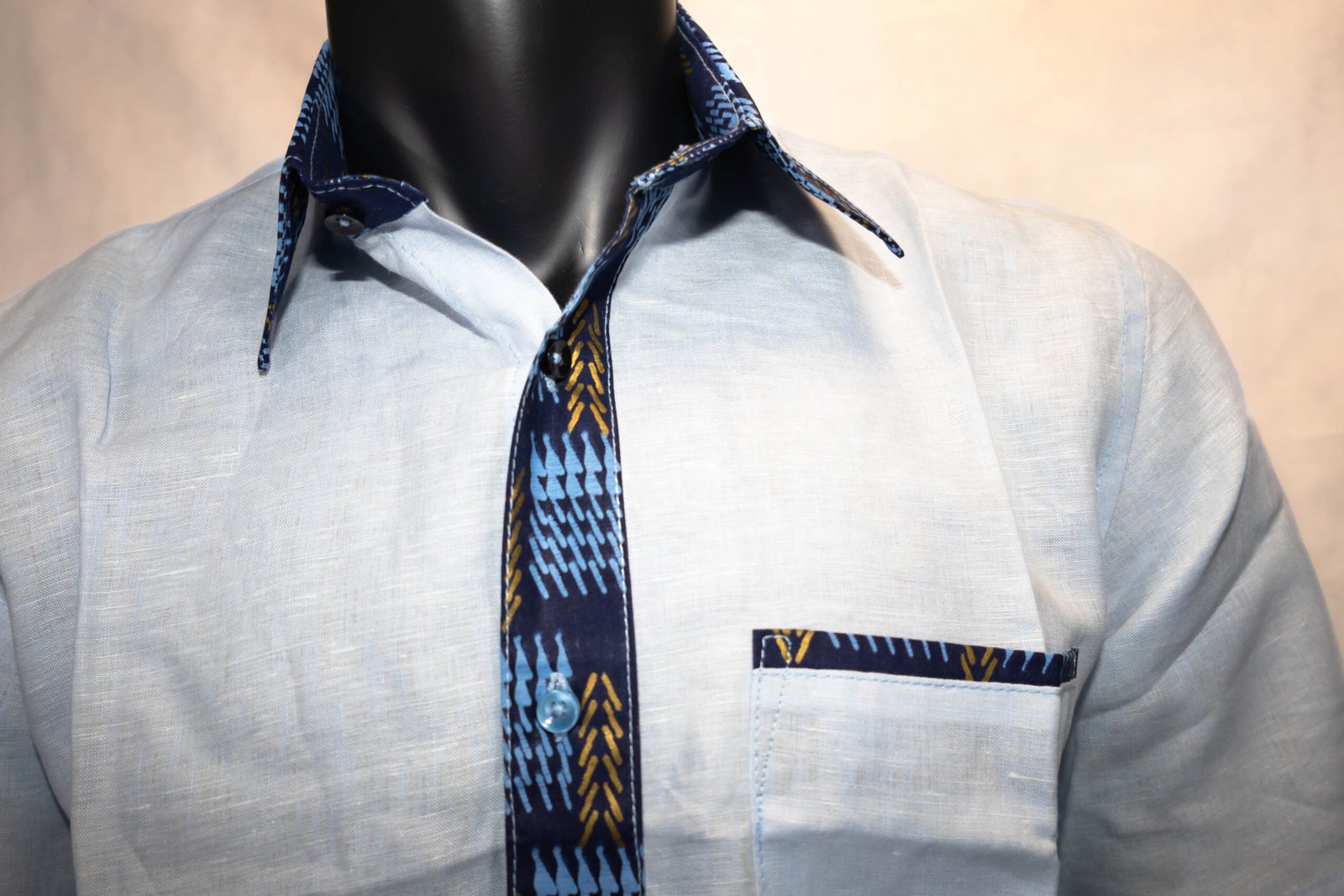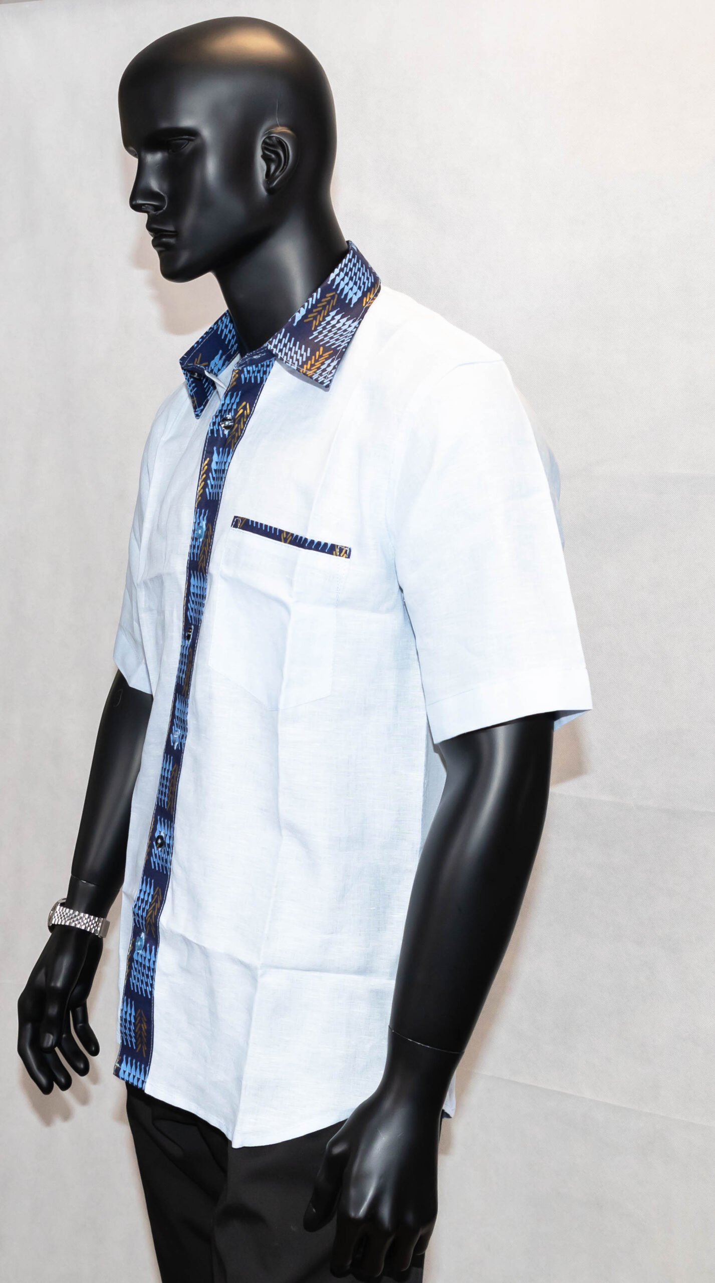 Chemise Homme col tailleur Lin blanc – wax bleu courte manche
