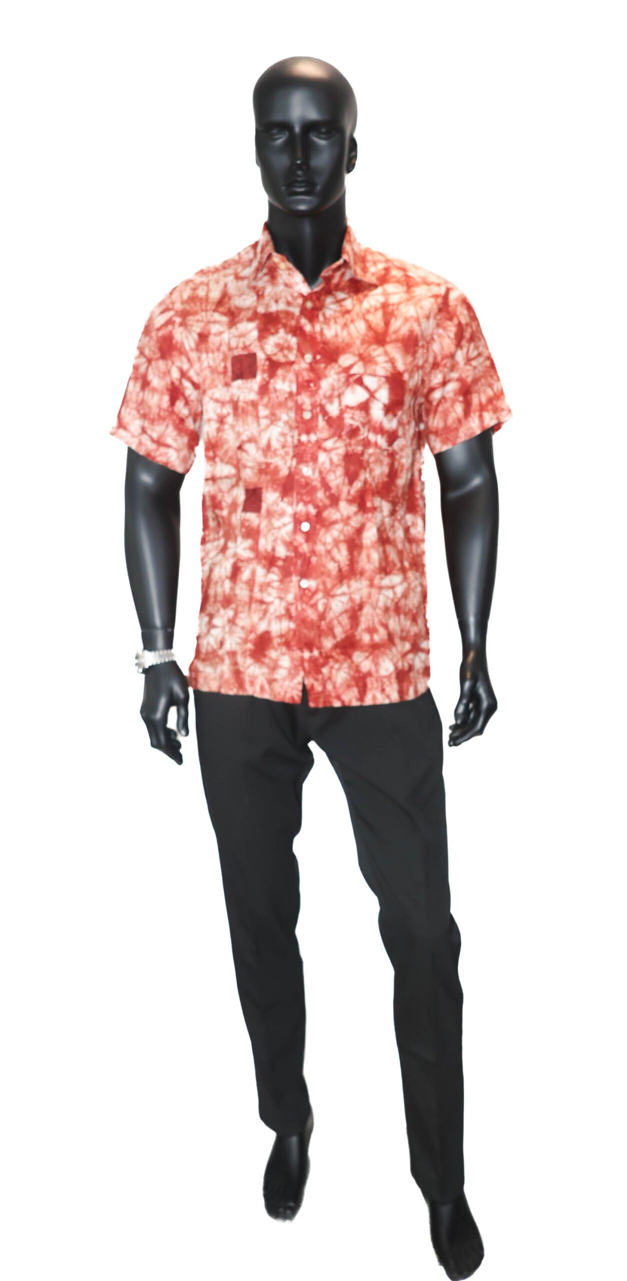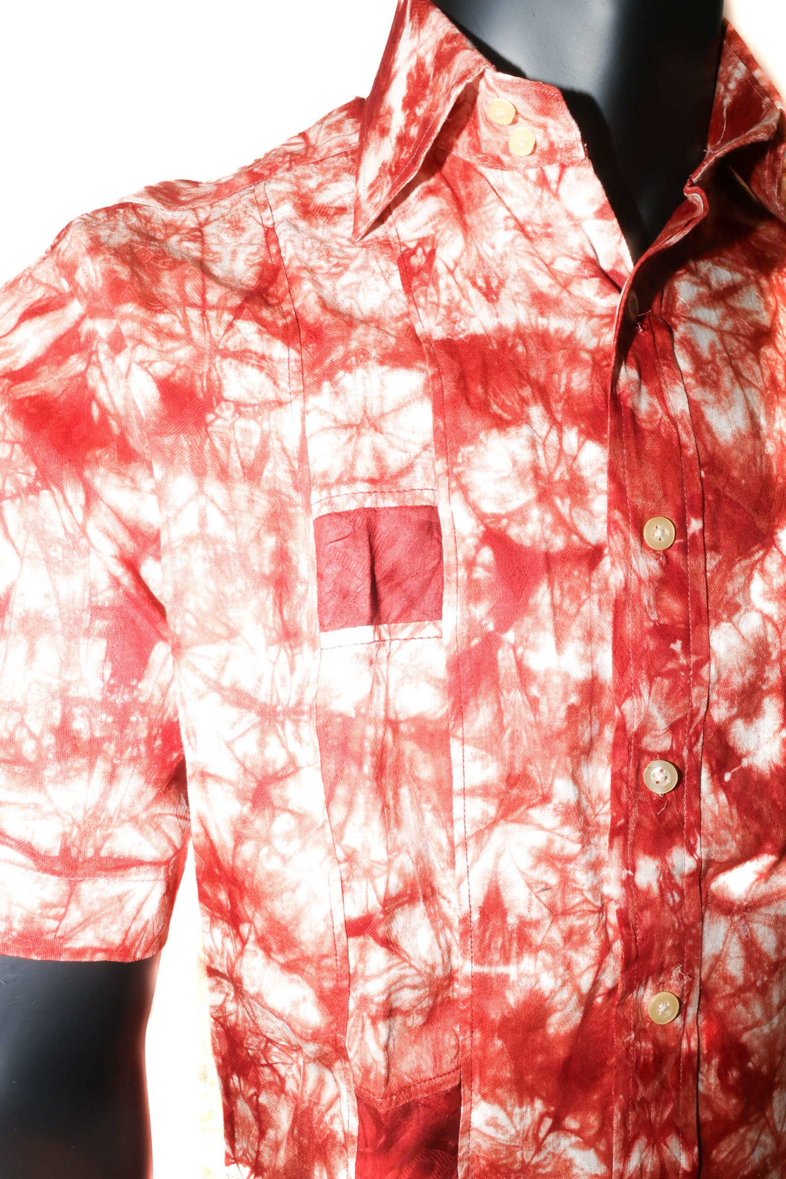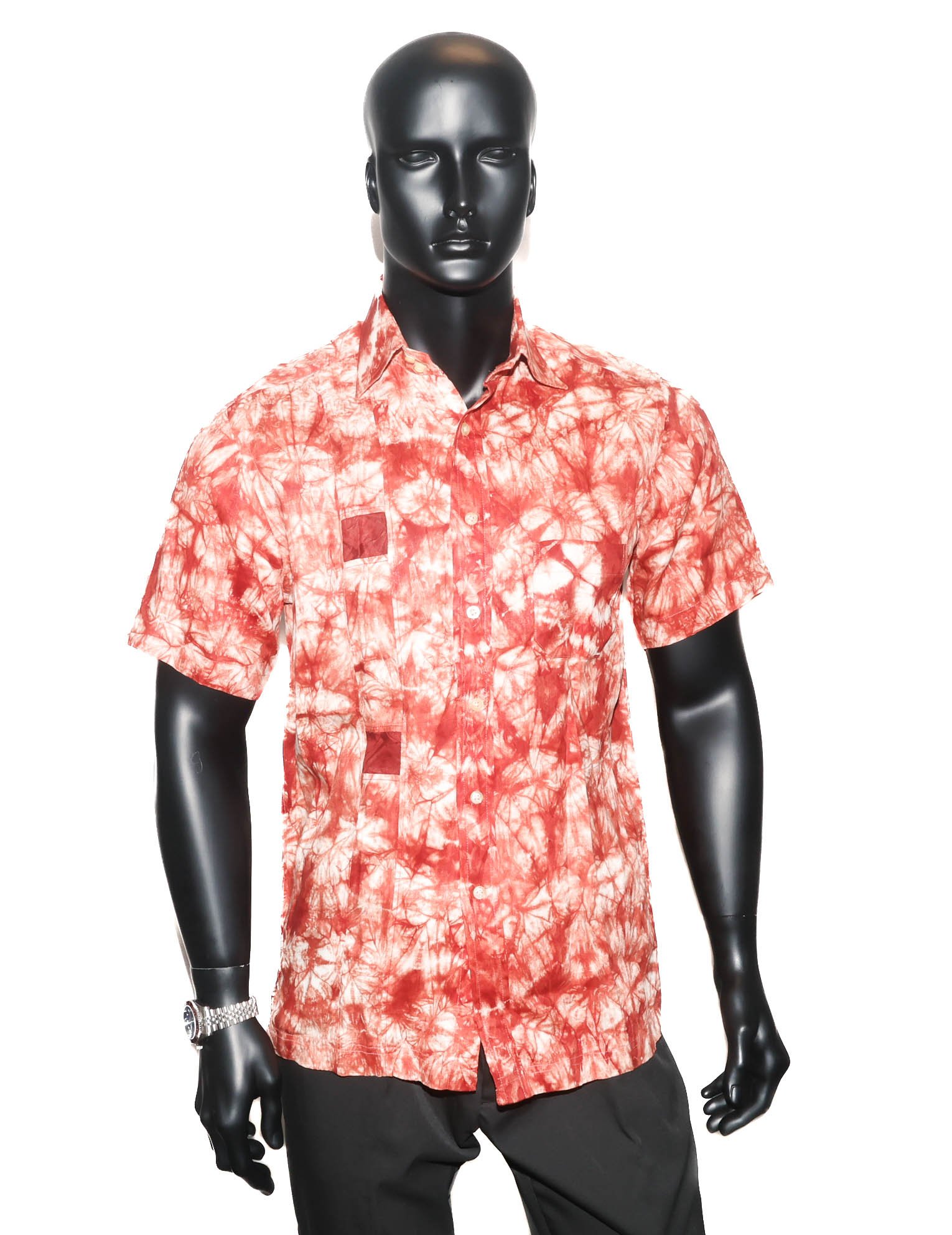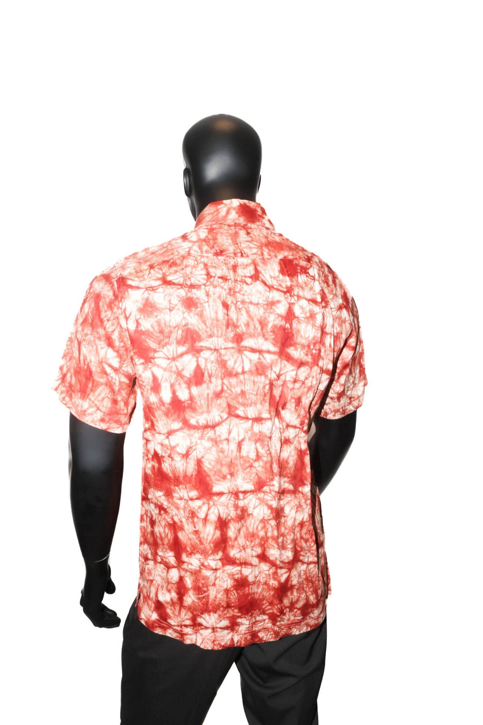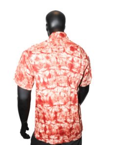 Chemise homme à manches courtes en tissu léger, avec motif tie-dye rouge et blanc au style moderne et artistique. Coupe confortable avec fermeture boutonnée et col classique, idéale pour un look estival décontracté et tendance.