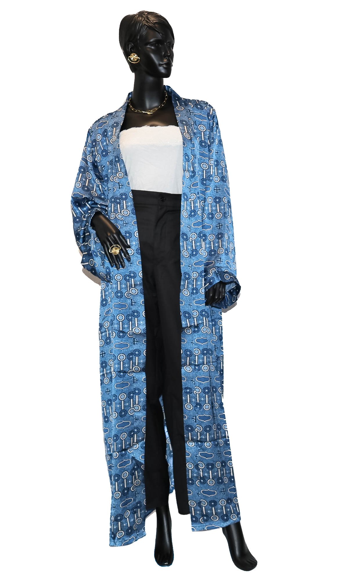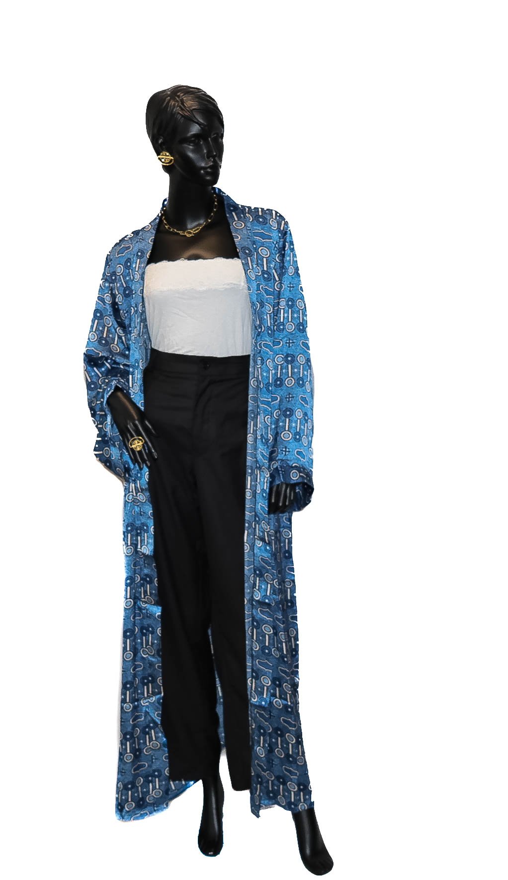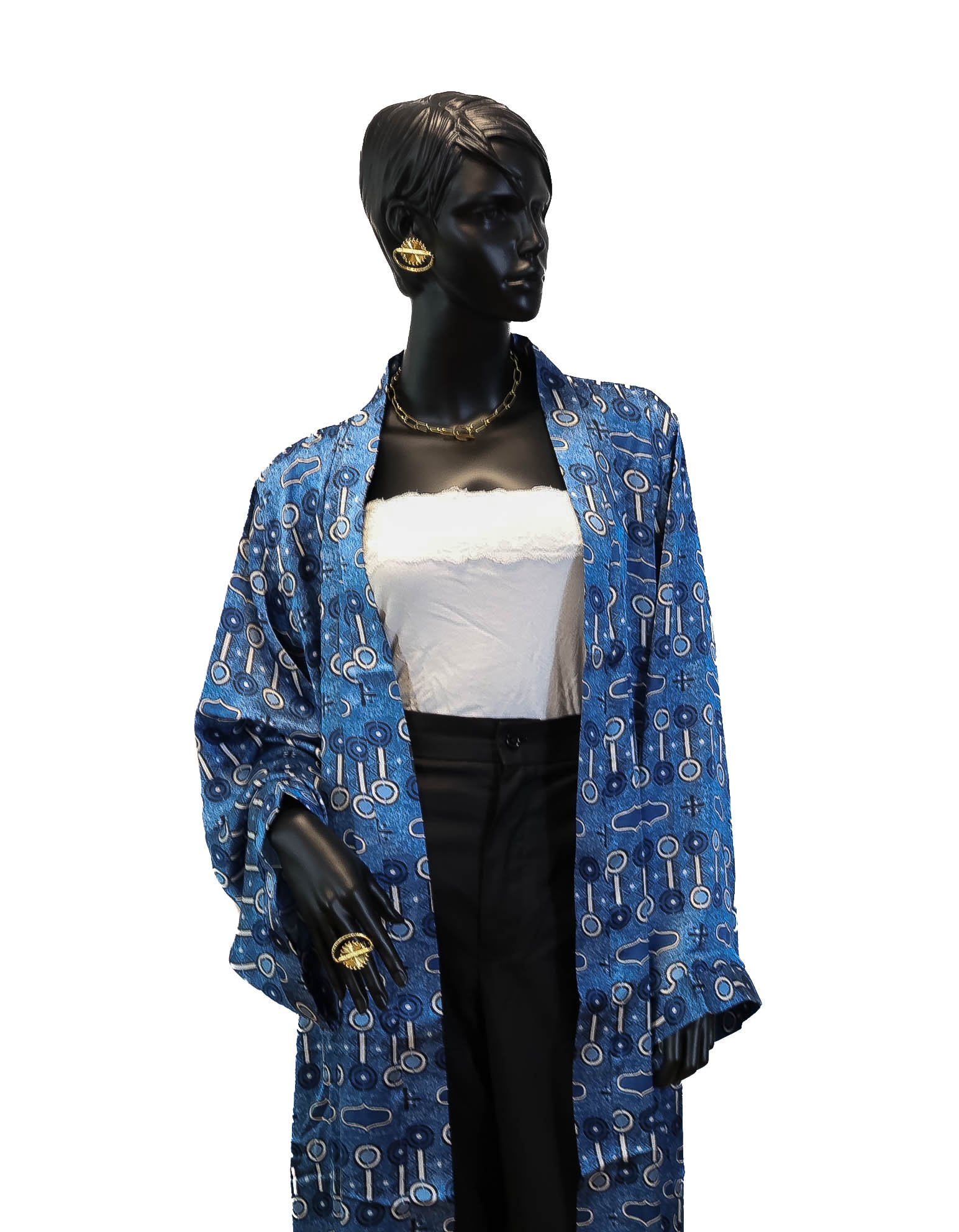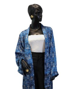 Sa coupe fluide et ouverte, inspirée du style kimono, offre un tombé élégant et confortable. Les manches larges et la longueur maxi apportent une silhouette élancée et sophistiquée, idéale pour un look chic et décontracté.