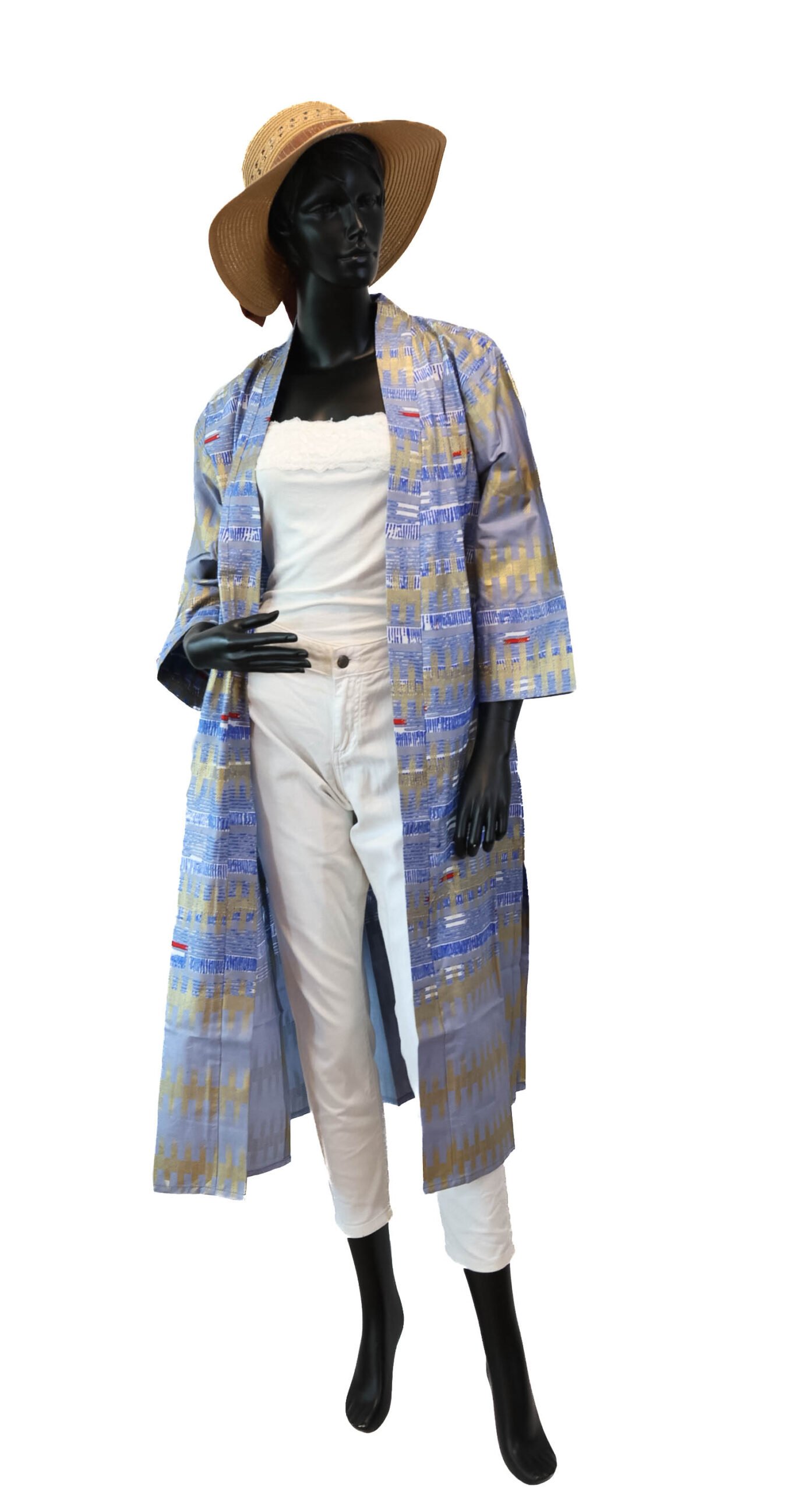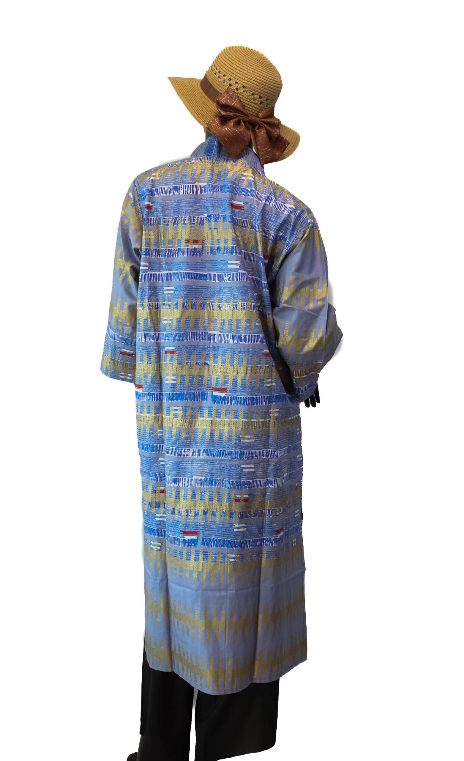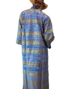 Apportez une touche d’authenticité et d’élégance à votre tenue avec cette tunique longue confectionnée en tissu wax. Son imprimé graphique dans des tons harmonieux de bleu et beige offre un style à la fois moderne et raffiné.